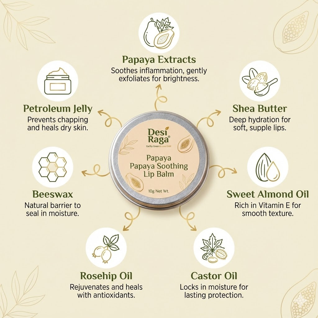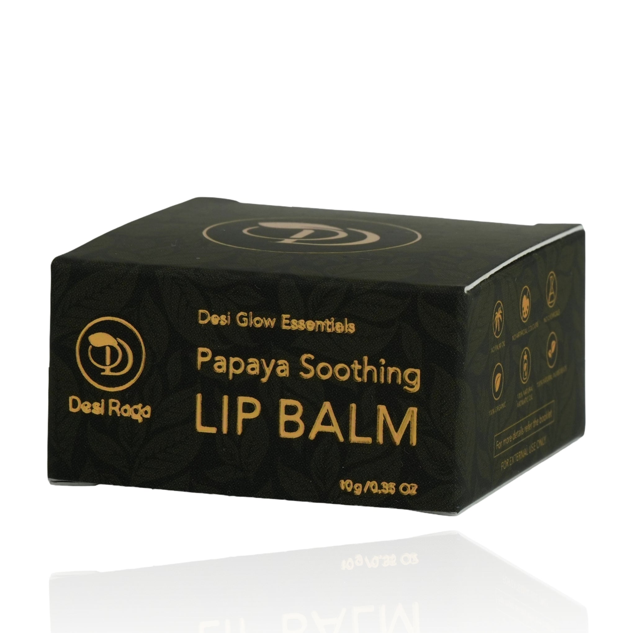 Indulge in the tropical embrace of Desi Raga's Papaya Soothing Lip Balm, a luxurious treatment designed to rescue and restore dry, parched lips. At the heart of this artisanal formulation is the gentle power of Papaya Extracts, renowned in Ayurveda for soothing inflammation and gently exfoliating to reveal smoother, brighter skin.